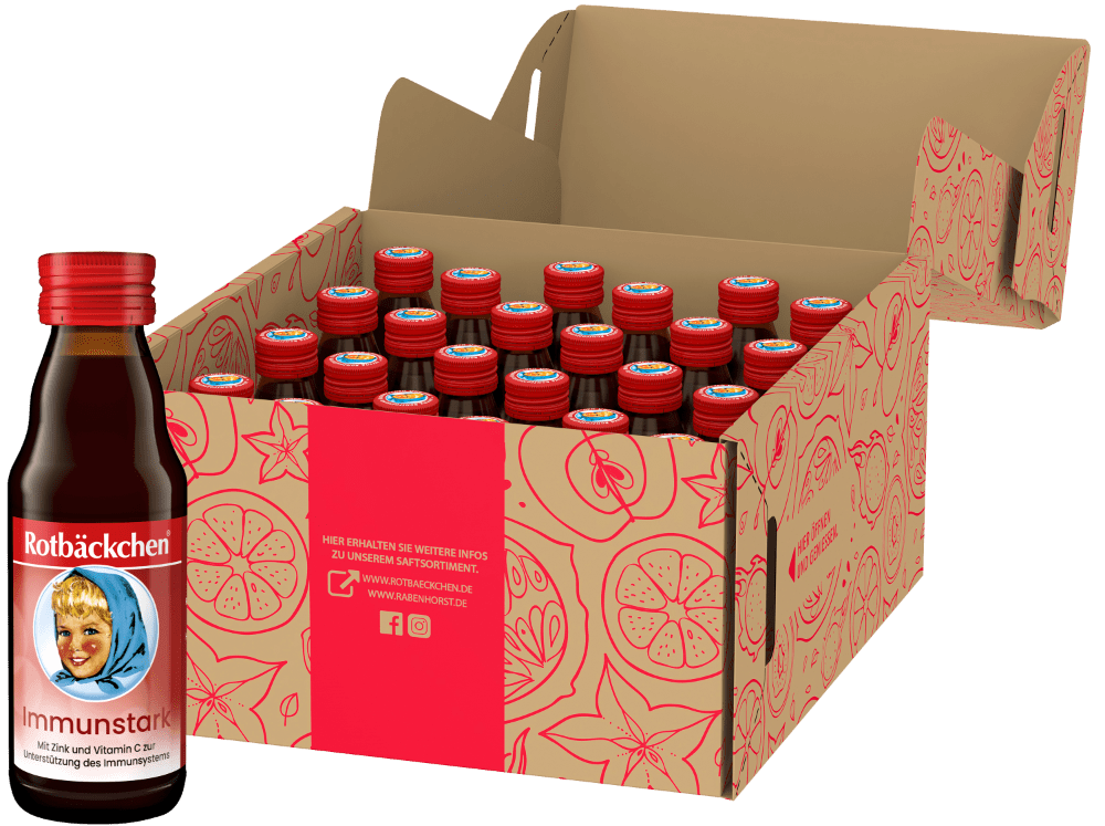 Unsere leckeren Rotbäckchen-Säfte werden ohne Konzentrate, sondern ausschließlich aus hochwertigen Direktsäften hergestellt. Fruchtsäften darf gemäß Gesetz kein Zucker zugesetzt werden, sie enthalten von Natur aus jedoch fruchteigenen Zucker. Rotbäckchen Immunstark ist auch für eine vegane Ernährung geeignet.