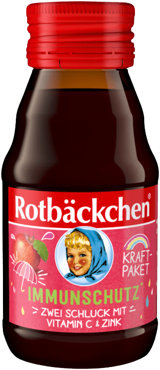 Unser Rotbäckchen Kraftpaket Immunschutz besteht aus sorgfältig ausgewählten roten Trauben, Äpfeln und leckeren Himbeeren, angereichert mit Vitamin C und Zink. Durch das handliche Shot-Format passt unser Kraftpaket in jede Tasche und versorgt dich und deine Familie immer und überall mit wichtigem Vitamin C und Zink, denn gesunde Abwehrkräfte sind nicht nur in der Erkältungszeit wichtig.