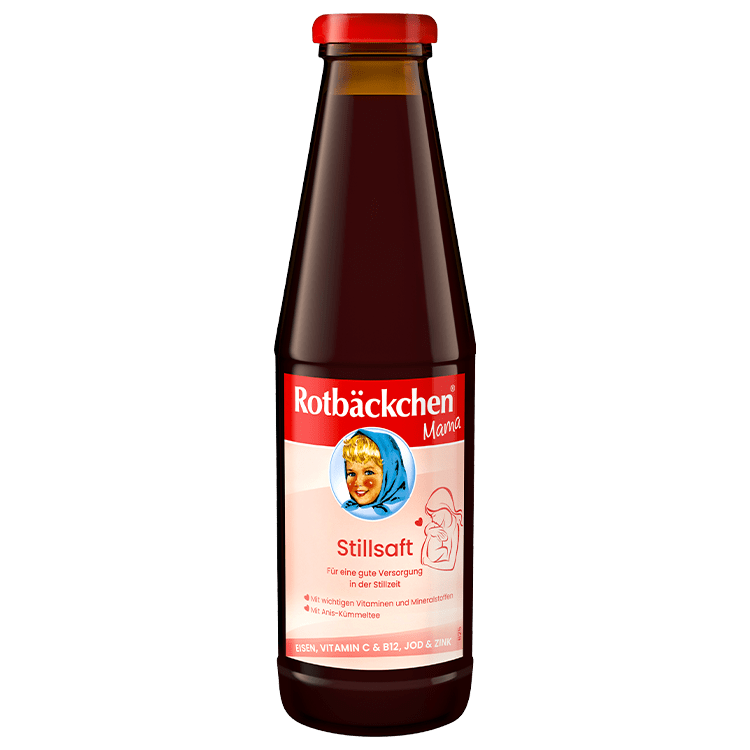 Unser Rotbäckchen Mama Stillsaft ist ein Mehrfruchtsaft mit Anis-Kümmeltee sowie Eisen, Jod, Zink und den Vitaminen C und B12. Auf der Basis leckerer Direktsäfte aus ausgewählten Äpfeln, roten Trauben sowie Aronia- und Holunderbeeren, leistet Mama Stillsaft einen Beitrag zu einer harmonischen Stillbeziehung und trägt gleichzeitig dazu bei, den Mehrbedarf an Nährstoffen in der Stillzeit zu decken.