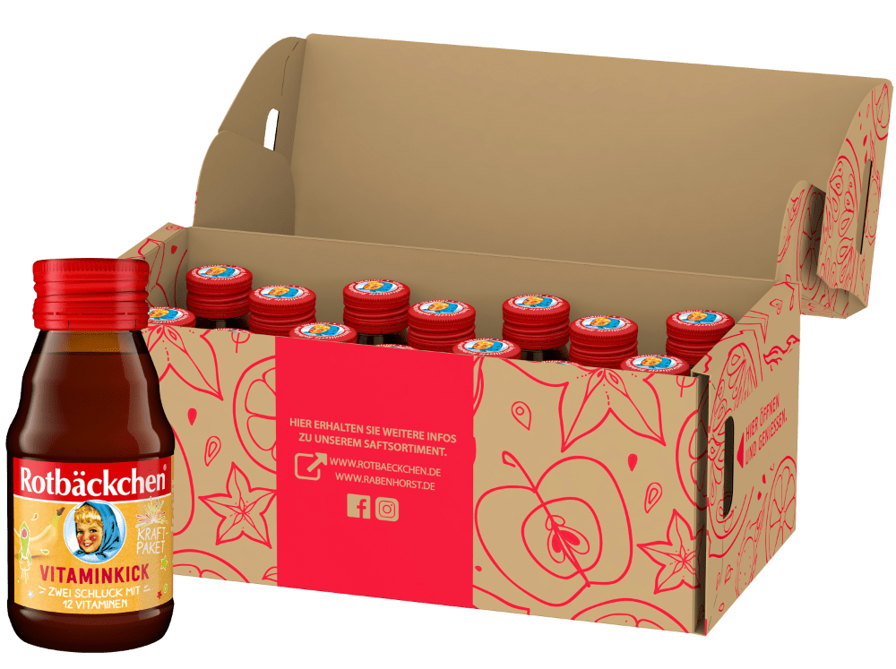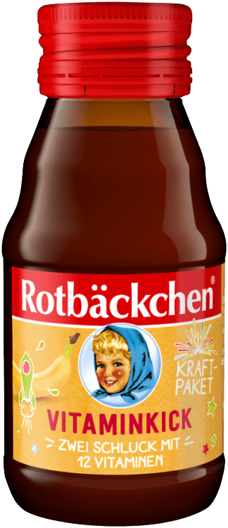 Unser Rotbäckchen Kraftpaket Vitaminkick ist ein Nahrungsergänzungsmittel auf der Basis sorgfältig ausgewählter Äpfel, weißer Trauben, Mangos und Bananen, ergänzt um 12 wichtige Vitamine.