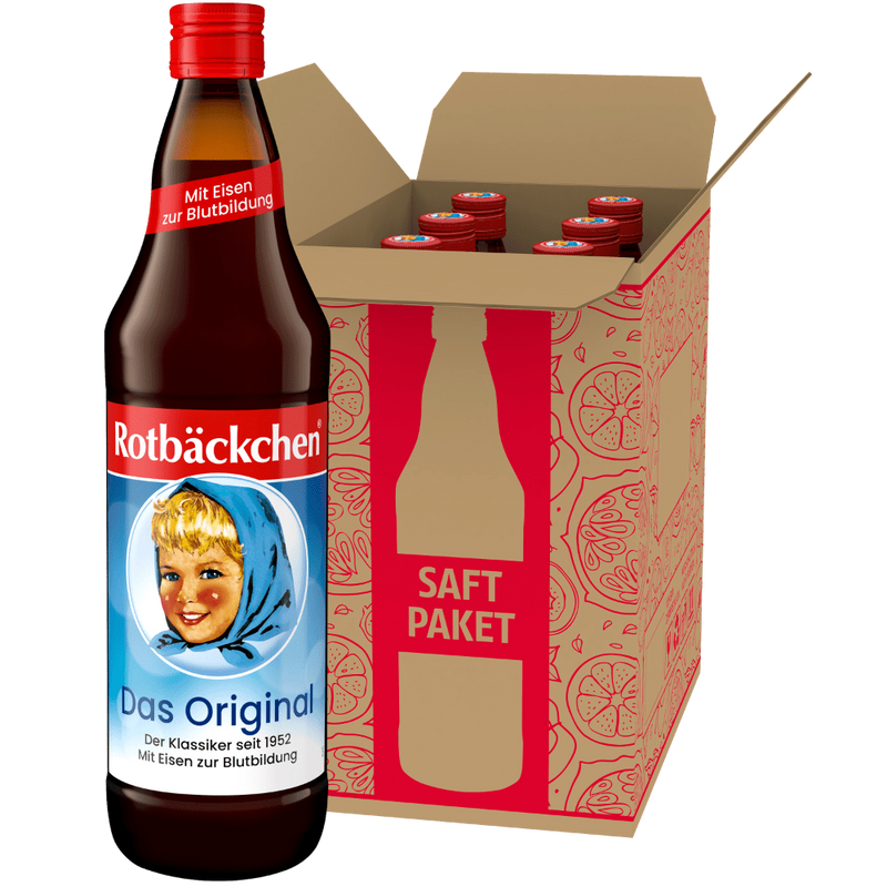Unser Rotbäckchen Das Original besteht aus sorgfältig ausgewählten roten und weißen Trauben, Äpfeln, Orangen, Acerolakirschen, Brombeeren, Kirschen sowie Honig und wird ergänzt mit dem Spurenelement Eisen.