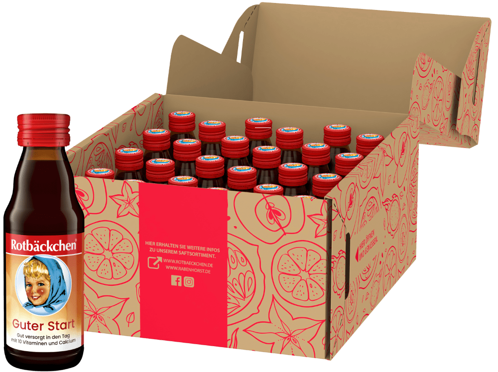 Unser Rotbäckchen Guter Start ist ein Mehrfruchtsaft aus sorgfältig ausgewählten roten Trauben, Äpfeln, Aronia- und Holunderbeeren, Bananen sowie Heidel- und Brombeeren. Ergänzt durch Calcium und zehn wertvolle Vitamine ist der Direktsaft der perfekte Begleiter am Morgen.