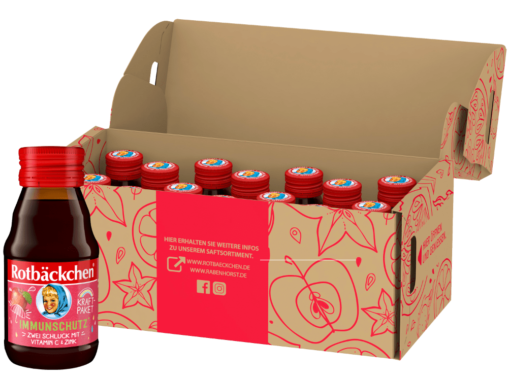 Unser Rotbäckchen Kraftpaket Immunschutz besteht aus sorgfältig ausgewählten roten Trauben, Äpfeln und leckeren Himbeeren, angereichert mit Vitamin C und Zink. Durch das handliche Shot-Format passt unser Kraftpaket in jede Tasche und versorgt dich und deine Familie immer und überall mit wichtigem Vitamin C und Zink, denn gesunde Abwehrkräfte sind nicht nur in der Erkältungszeit wichtig.