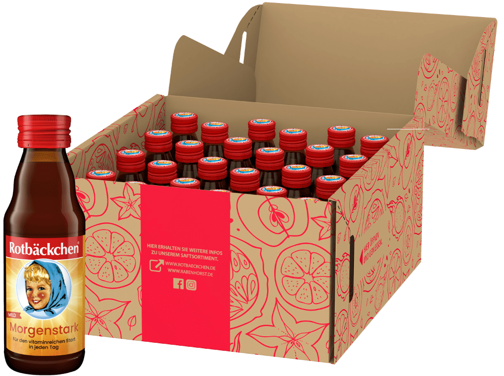Unsere leckeren Rotbäckchen-Säfte werden ohne Konzentrate, sondern ausschließlich aus hochwertigen Direktsäften hergestellt. Fruchtsäften darf gemäß Gesetz kein Zucker zugesetzt werden, sie enthalten von Natur aus jedoch fruchteigenen Zucker. Rotbäckchen Morgenstark ist auch für eine vegane Ernährung geeignet.
