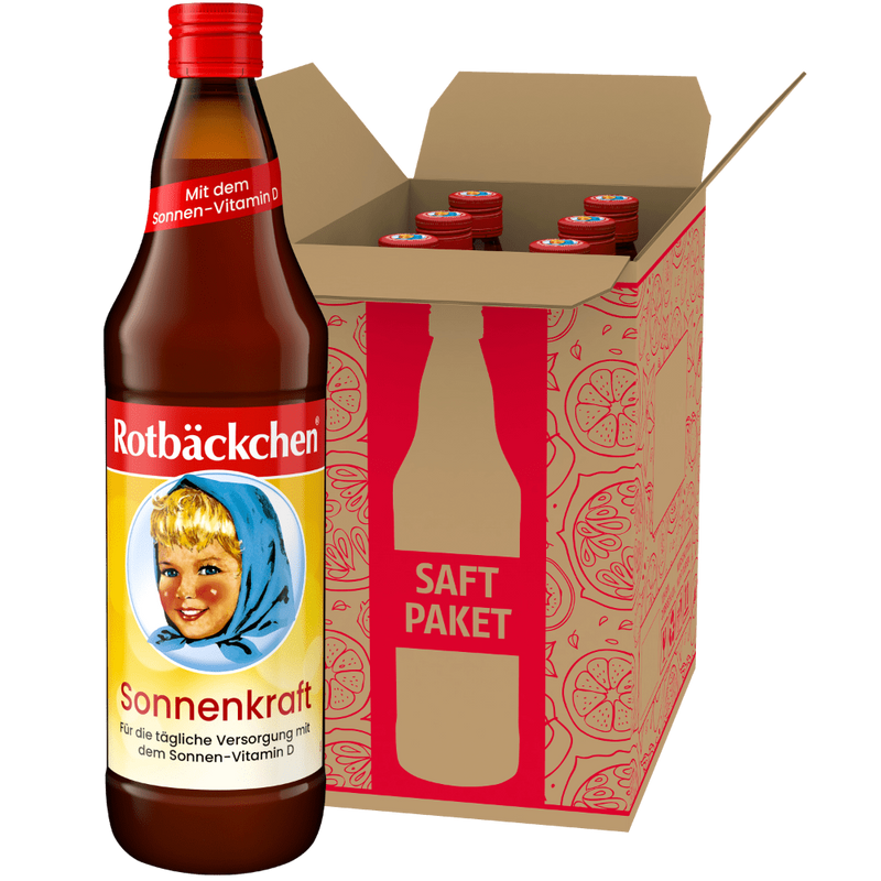 Apfelsaft, Mangomark, Acerolamark, Cacliumgluconat, Vitamin D3 Eine Tagesportion à 200 ml deckt die Referenzmenge an Calcium zu 33 % und an Vitamin D zu 100 %. Wenn Vitamin D vom Körper (z.B. aufgrund fehlender Sonneneinstrahlung) nicht gebildet werden kann, empfiehlt die Deutsche Gesellschaft für Ernährung (DGE) etwa 20 µg täglich als angemessene Vitamin-D-Zufuhr für Kinder ab einem Jahr über alle folgenden Altersstufe hinweg und ebenso bei stillenden und schwangeren Frauen. 100 ml Rotbäckchen Sonnenkraft decken die Referenzmenge an Calcium gemäß der Deutschen Gesellschaft für Ernährung bei Wir empfehlen eine ausgewogene und abwechslungsreiche Ernährung und eine gesunde Lebensweise. Die Flasche vor Gebrauch gut schütteln. Nach Anbruch im Kühlschrank aufbewahren und innerhalb von 5 Tagen verbrauchen.Zutaten: