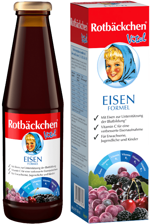 Unsere Rotbäckchen Vital Eisen Formel ist ein Nahrungsergänzungsmittel mit Eisen und den Vitaminen C, B1, B2, B6 und B12. Die Basis bilden sorgfältig ausgewählte, natürliche Zutaten: rote Trauben, Aroniabeeren, Holunder, Kirschen und Brombeeren. Ergänzt um Eisen und Vitamin C sowie die Vitamine B1, B2, B6 und B12 hilft das Nahrungsergänzungsmittel gezielt dabei den Bedarf dieser Nährstoffe zu decken.