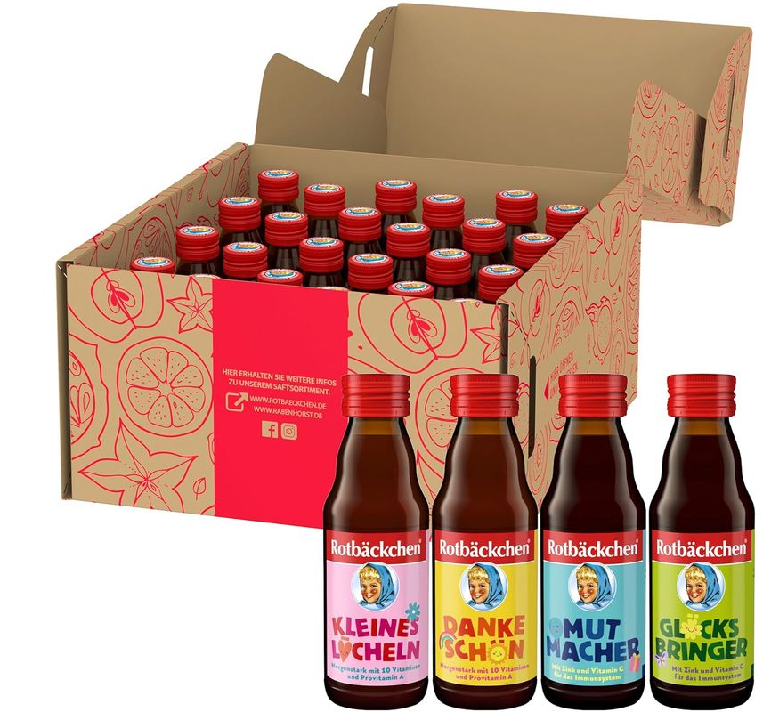 Rotbäckchen Dankeschön: Birnen-, Apfel-, Orangen- und Passionsfruchtsaft, Bananen-, Mango- und Aprikosenmark, Ananassaft, Acerolamark, Guavenmark, Grapefruitsaft, Provitamin A, Vitamine B1, B2, B6, B12, C, E, Niacin, Panthothenat, Folsäure, Biotin Eine Tagesportion à 125 ml deckt die Referenzmenge an Vitamin A zu 38% und die übrigen Vitamine zu jeweils 63%. Wir empfehlen eine ausgewogene, abwechslungsreiche Ernährung und eine gesunde Lebensweise. Die Flasche vor Gebrauch gut schütteln. Nach Anbruch im Kühlschrank aufbewahren und innerhalb von 5 Tagen verbrauchen. Rotbäckchen Mutmacher: Roter Traubensaft, Apfelsaft, Aroniasaft, Holundersaft, Acerolamark, Vitamin C, Zinkgluconat Eine Tagesportion à 125 ml deckt die Referenzmenge an Zink zu 19% und Vitamin C zu 125%. Für die tägliche Nährstoffzufuhr empfiehlt die Deutsche Gesellschaft für Ernährung (DGE), abhängig von Alter oder Fokusgruppe, unterschiedliche Referenzmengen. So decken 100 ml die Referenzmenge an Zink gemäß der Deutschen Gesellschaft für Ernährung bei: Wir empfehlen eine ausgewogene, abwechslungsreiche Ernährung und eine gesunde Lebensweise. Die Flasche vor Gebrauch gut schütteln. Nach Anbruch im Kühlschrank aufbewahren und innerhalb von 5 Tagen verbrauchen. Rotbäckchen Glücksbringer: Roter Traubensaft, Apfelsaft, Aroniasaft, Holundersaft, Acerolamark, Vitamin C, Zinkgluconat Eine Tagesportion à 125 ml deckt die Referenzmenge an Zink zu 19% und Vitamin C zu 125%. Für die tägliche Nährstoffzufuhr empfiehlt die Deutsche Gesellschaft für Ernährung (DGE), abhängig von Alter oder Fokusgruppe, unterschiedliche Referenzmengen. So decken 100 ml die Referenzmenge an Zink gemäß der Deutschen Gesellschaft für Ernährung bei: Wir empfehlen eine ausgewogene, abwechslungsreiche Ernährung und eine gesunde Lebensweise. Die Flasche vor Gebrauch gut schütteln. Nach Anbruch im Kühlschrank aufbewahren und innerhalb von 5 Tagen verbrauchen. Rotbäckchen Kleines Lächeln: Birnen-, Apfel-, Orangen- und Passionsfruchtsaft, Bananen-, Mango- und Aprikosenmark, Ananassaft, Acerolamark, Guavenmark, Grapefruitsaft, Provitamin A, Vitamine B1, B2, B6, B12, C, E, Niacin, Panthothenat, Folsäure, Biotin Eine Tagesportion à 125 ml deckt die Referenzmenge an Vitamin A zu 38% und die übrigen Vitamine zu jeweils 63%. Wir empfehlen eine ausgewogene, abwechslungsreiche Ernährung und eine gesunde Lebensweise. Die Flasche vor Gebrauch gut schütteln. Nach Anbruch im Kühlschrank aufbewahren und innerhalb von 5 Tagen verbrauchen.Zutaten